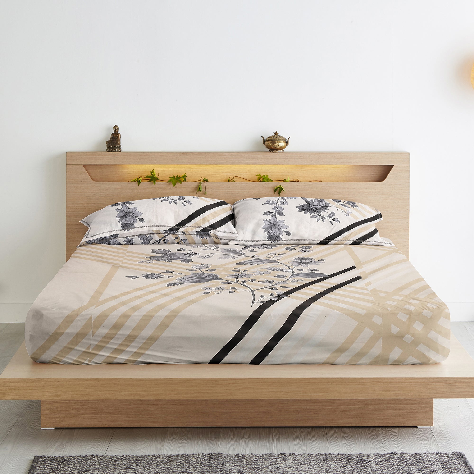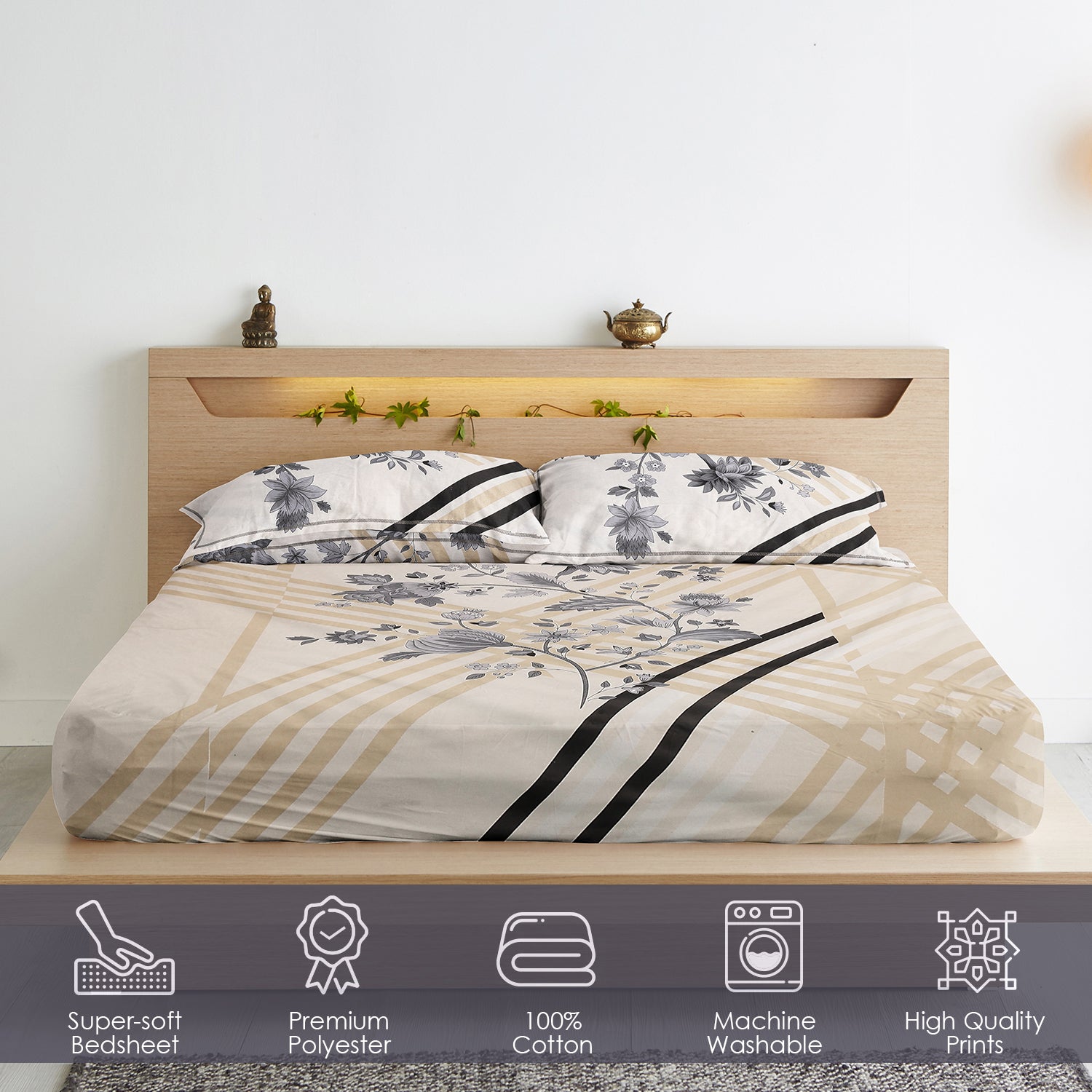 Bring home the perfect blend of modern elegance and timeless charm with our Kesar Rang Bedsheet. Designed with a soothing beige base, bold geometric stripes, and intricately detailed leaf motifs in soft grey, this piece transforms your bedroom into a space of refined beauty.